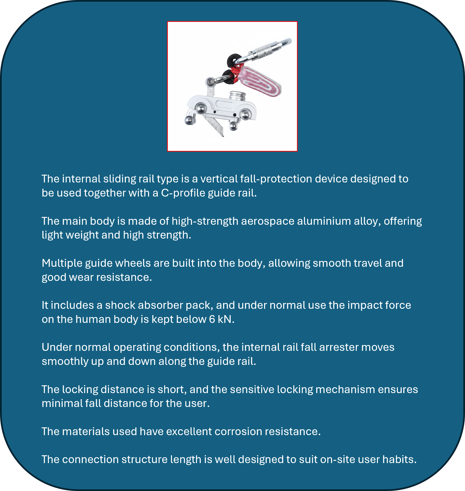 Unlike conventional ladders, this unit comes with an integrated vertical fall-arrest rail running along the entire height, allowing the use of a full body harness and sliding arrestor to protect personnel during climbing.